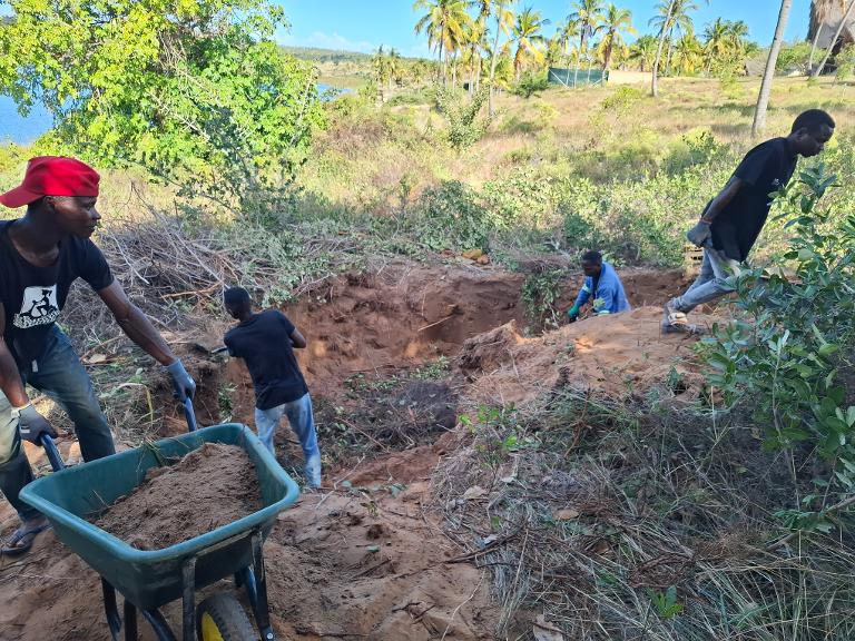 Til betong trengs sand, og sand er det nok av i Mosambik. Det gjelder bare å grave den opp. For å unngå mulige ulykker i nærhet til skolen, ble sanden hentet ca. 30 meter fra elevenes friområde. Arbeiderne brukte en drøy uke på å grave og trille sanden oppover med trillebår. Man kunne bestilt mer sand levert nær bygget for å gjøre arbeidet lettere, men igjen - det ville ha redusert inntektsmulighetene for de som jobbet på prosjektet. Dette er mennesker som setter stor pris på muligheten til å arbeide, selv om det er fysisk krevende.