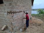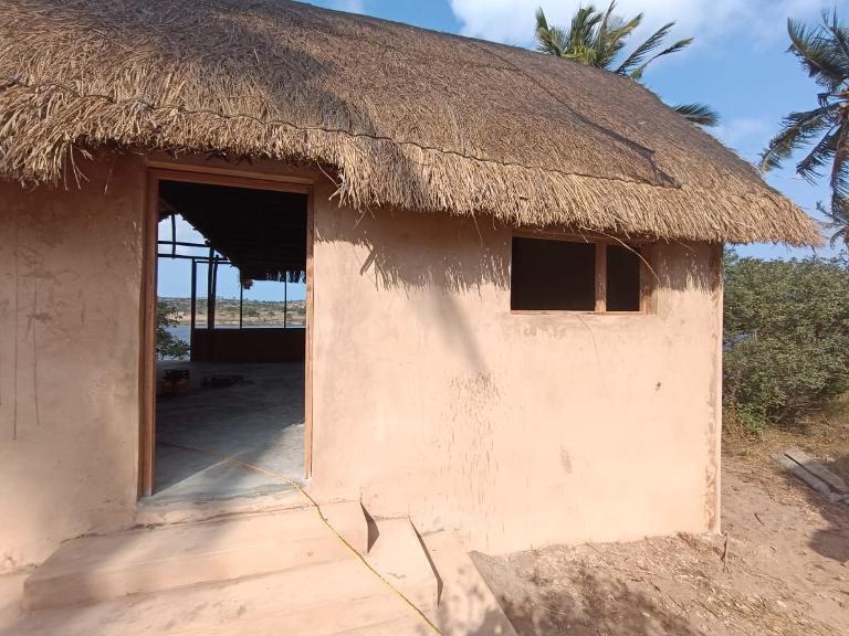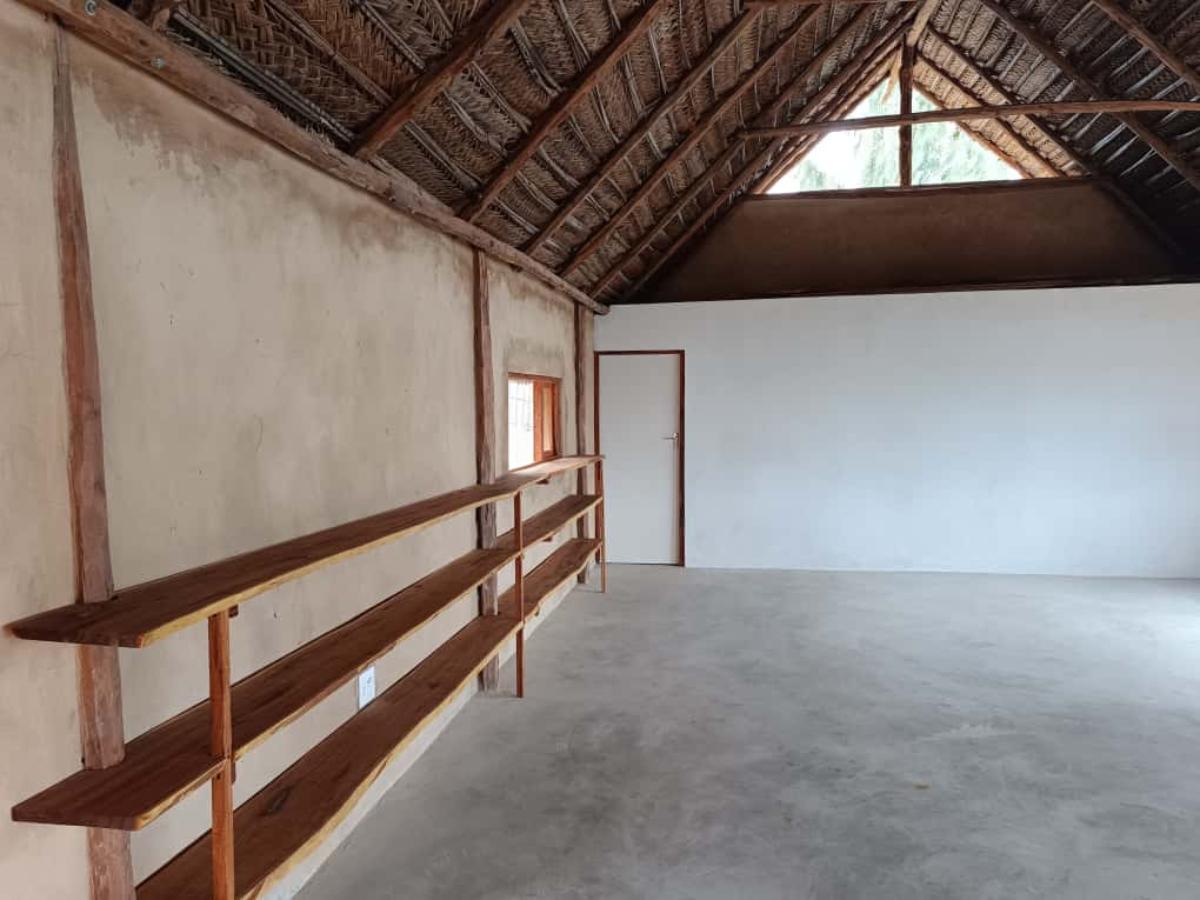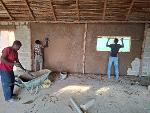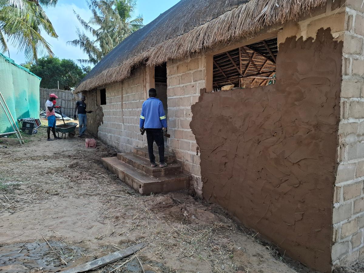 Med taket ferdigstilt var klasserommet i praksis klart. Et av de siste stegene var å legge puss på veggene – en blanding av sement, vanlig sand og litt rød sand som gir den karakteristiske rødfargen. Denne prosessen er tidkrevende og krever tålmodighet, da samme område må bearbeides flere ganger med ulike verktøy. Men - når det gjøres riktig, blir resultatet svært pent. Noen av innerveggene skal på sikt males, men de fleste vil beholde den røde fargen.
