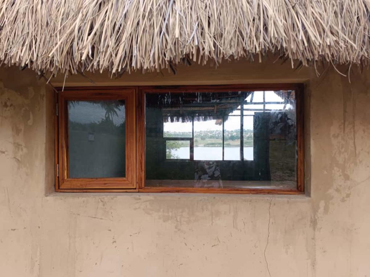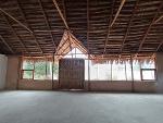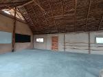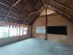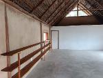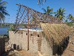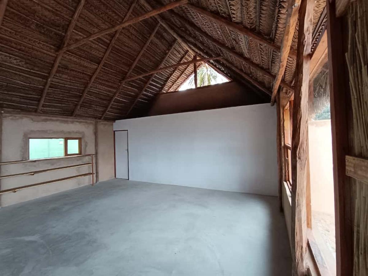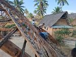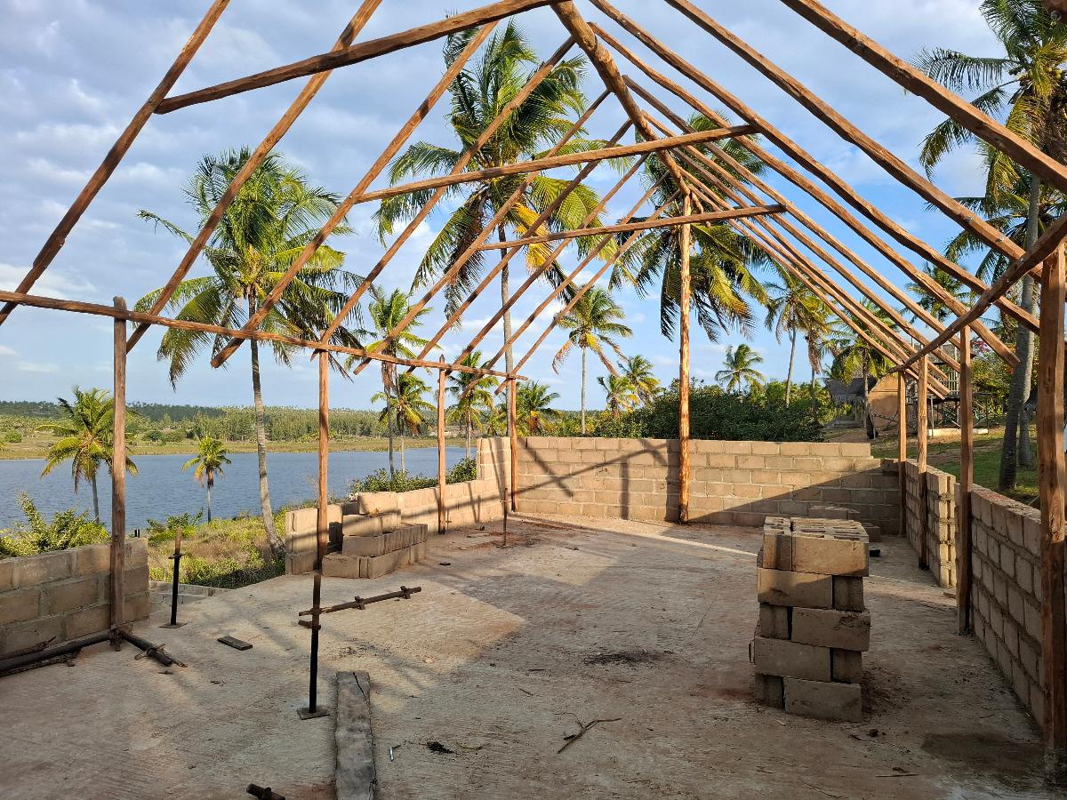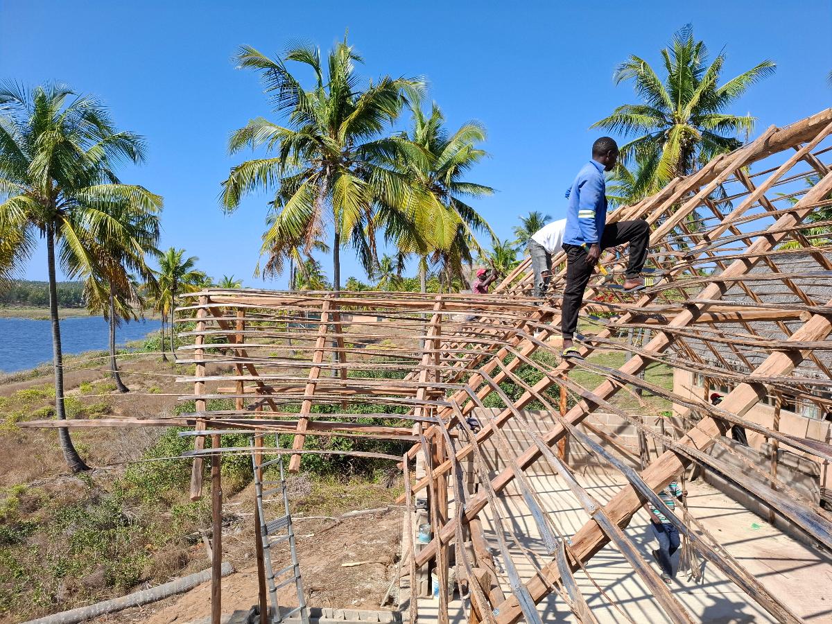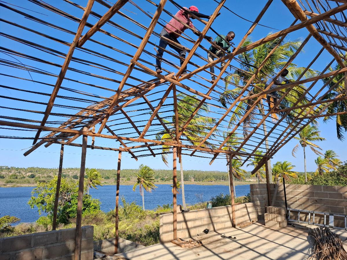 Taket ble bygget med en tradisjonell trekonstruksjon, hvor mønebjelken består av tre kraftige trestammer av tresorten Simbiri. Dette treslaget har en tetthet og vekt som kan sammenlignes med eik, og ble brukt selv om stammene fortsatt var ferske og våte. For å håndtere vekten ble bjelken først delt i to og løftet manuelt, med støtte fra en hovedstolpe og improviserte støtter i form av stablede Coca-Cola-kasser. Etter at begge deler var på plass, ble skjøtene boltet sammen igjen. Sperrene ble deretter montert, sammen med tverrgående støtter som stabiliserte hele takkonstruksjonen. Etter en uke var den bærende strukturen ferdig, og arbeidet kunne gå videre til lekting.