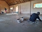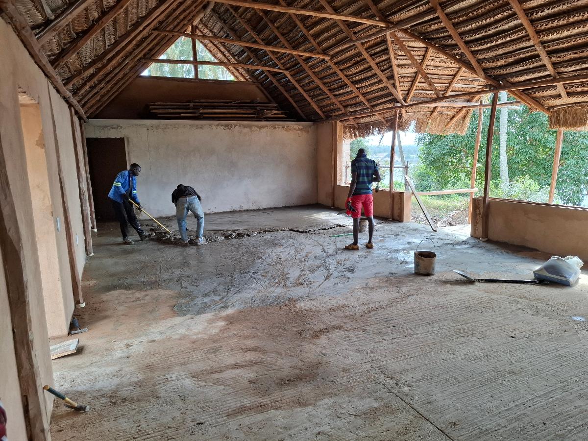 Etter at pussen var lagt på innerveggene, ble det lagt et avrettingslag over den rå betongen på gulvet. På det lokale markedet i Mosambik finnes det ikke selvnivellerende masse, noe som ville gjort arbeidet enklere. Derfor måtte avrettingslaget spres og poleres for hånd.