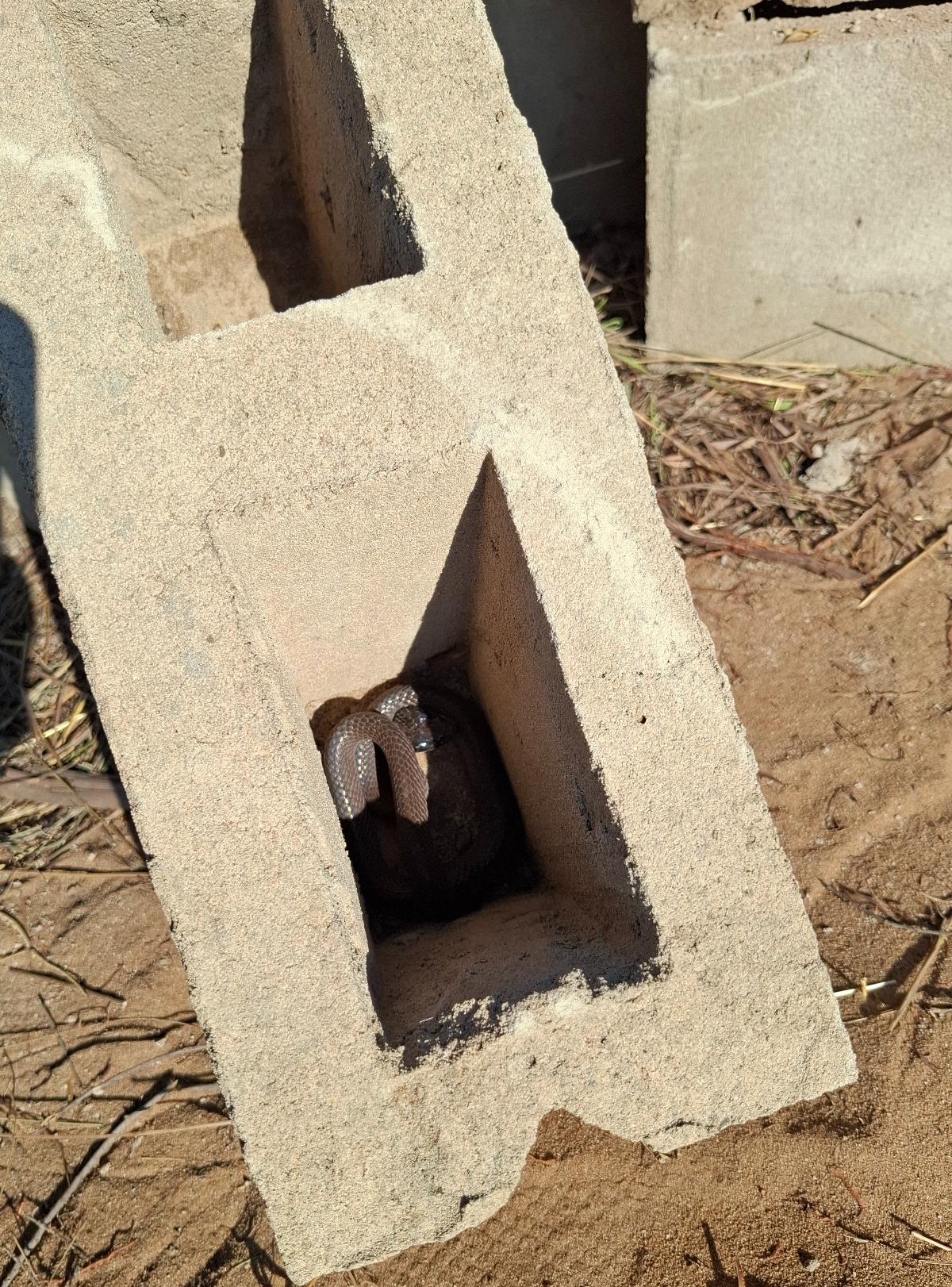 Fire murstein hadde blitt lastet på trillebåra og trillet inn på byggeplassen. Ved avlevering, oppdaget Radek en liten, svart slange krøllet sammen i en av stenene. Den hadde ligget helt rolig under hele transporten. En ukjent slange på byggeplassen, i nærheten av en skole med små barn, var alt annet enn heldig. Likevel måtte dette dokumenteres, og stenen ble dermed løftet forsiktig bort fra området og ut i solen for gunstige bildeforhold.