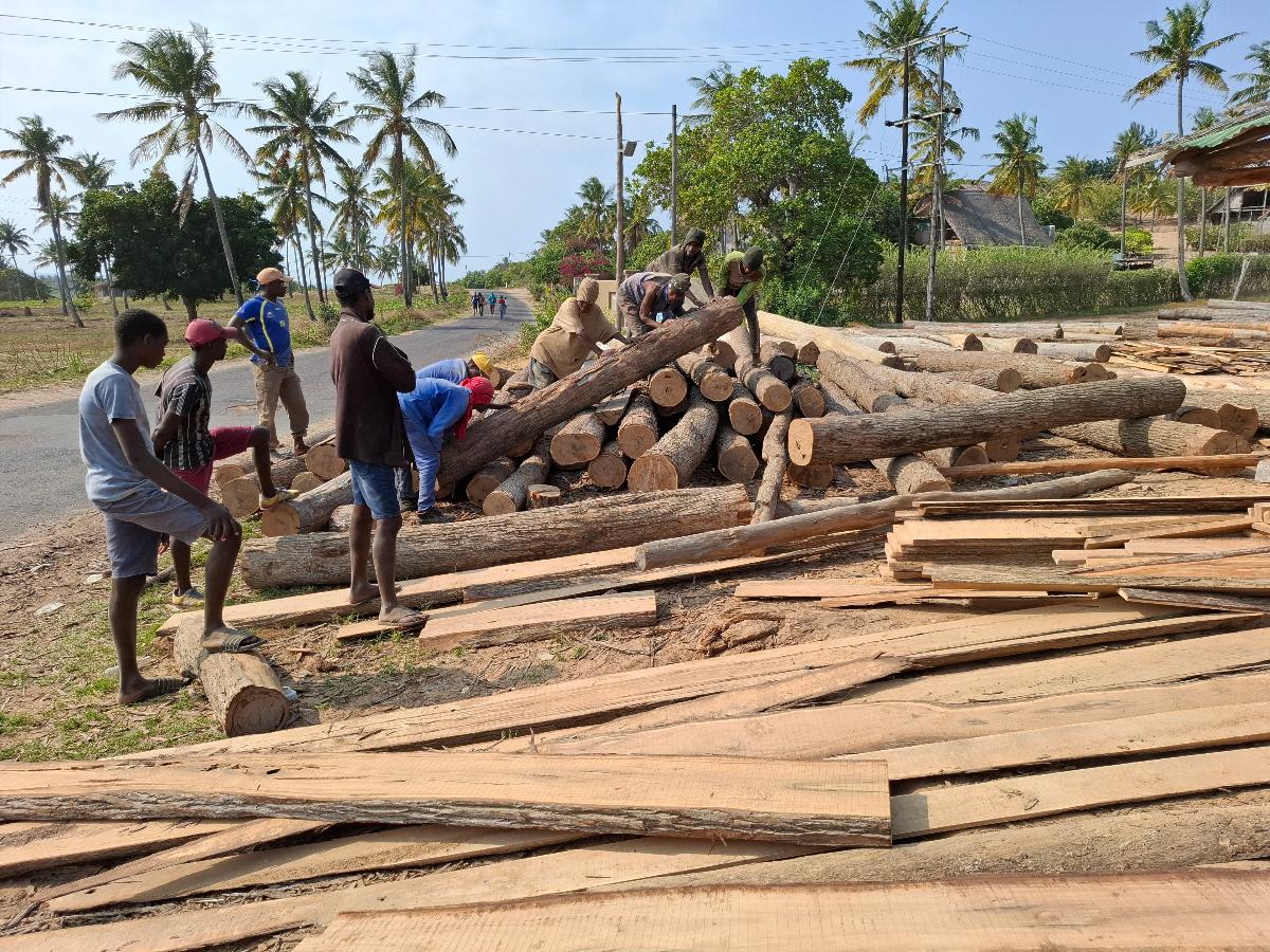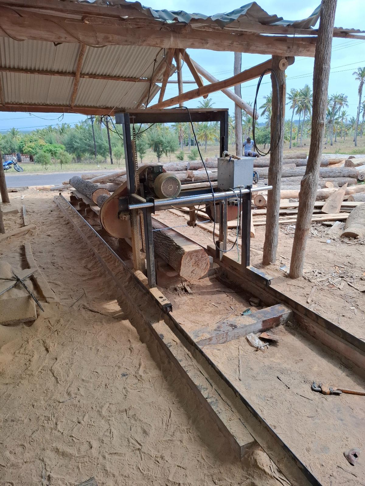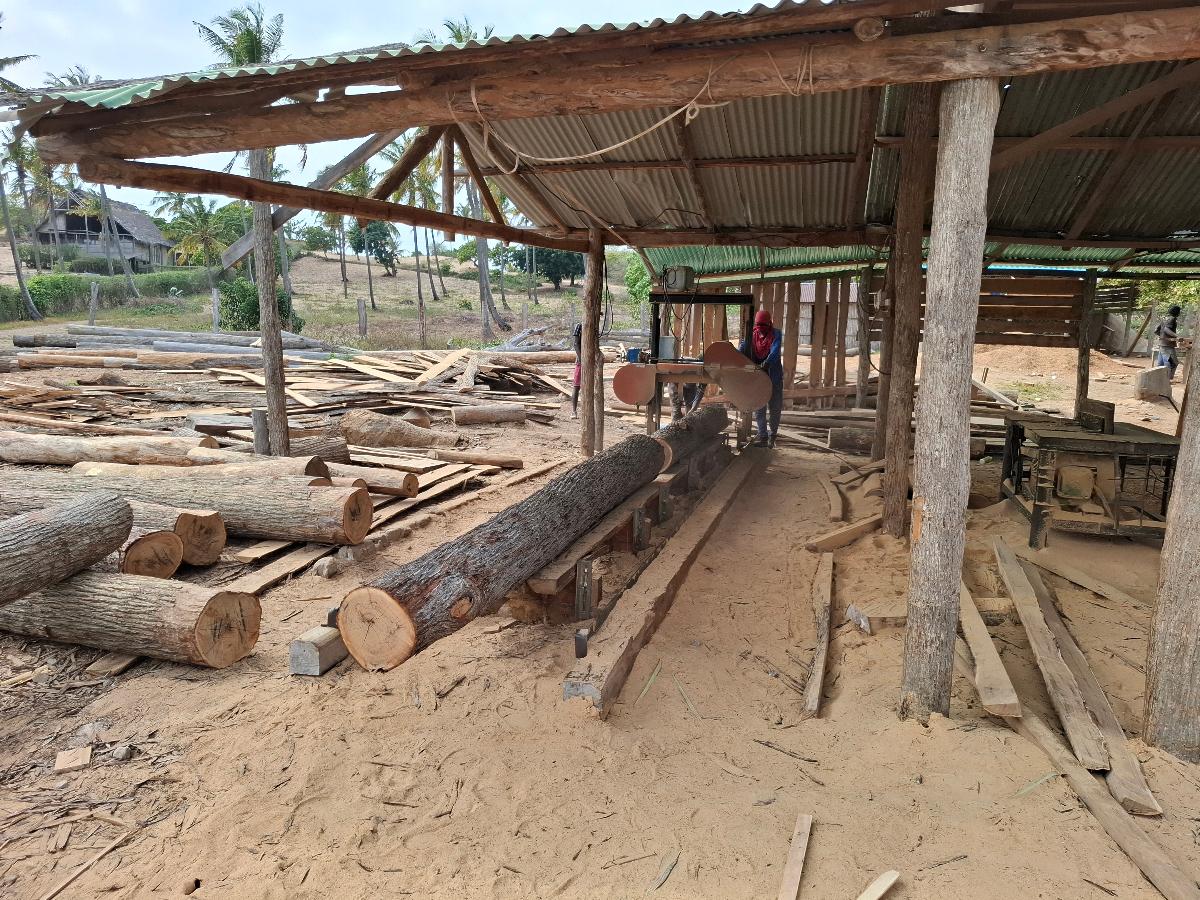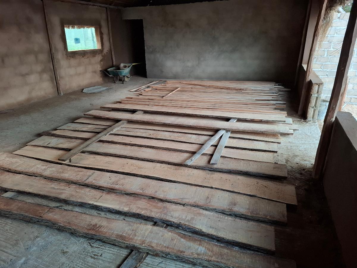 Mens arbeidet med pussen pågikk, ble det også hentet treverk til dører, vinduer og hyller. Målene ble tatt, en kapp-liste ble laget, og turen gikk til det lokale sagbruket. Fire trestammer ble valgt ut blant de som lå ved veien, og disse ble kuttet til ønskede dimensjoner. Treverket var fortsatt vått og måtte tørke i noen uker før det kunne bearbeides videre.