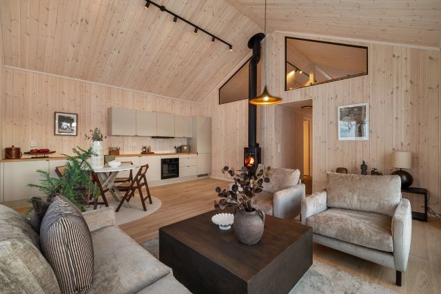 Den første hytta stod ferdig vinteren 2024, og ligger nå ute for salg.